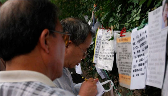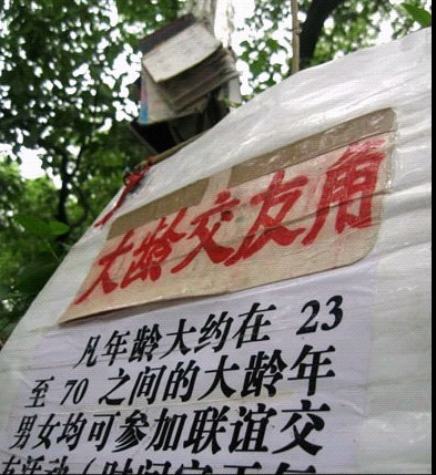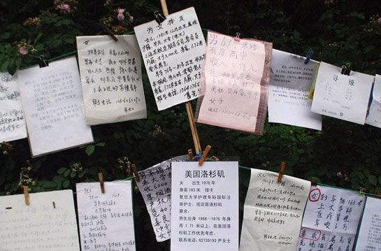 在上海人民公園一角,掛滿了上百張手寫征婚標簽。這樣的“征婚角”每周末舉辦一次。然而,到征婚角去的大多數是年輕人的父母,而非他們本身。父母擔心子女的婚姻問題,企望以這中方式,為子女物色到合適的約會對象。