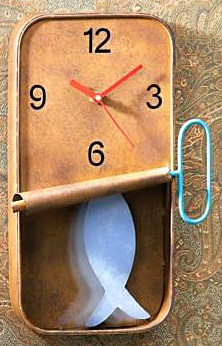 這是款有趣的掛鐘,以沙丁魚罐頭為外觀設計,里面的沙丁魚甚至還可以擺動。