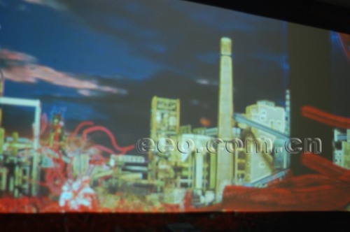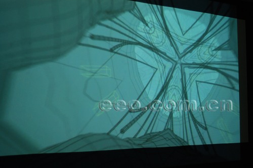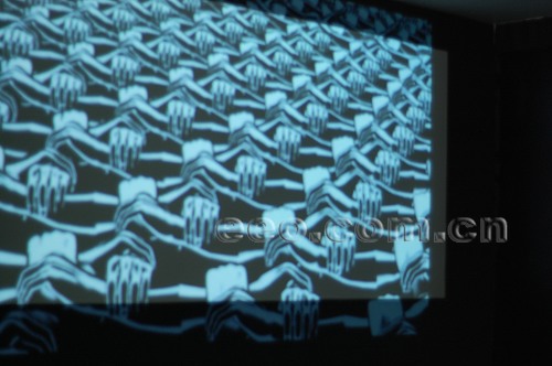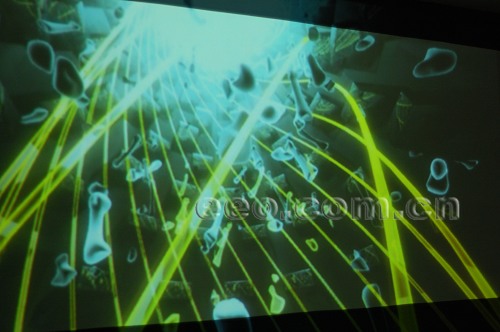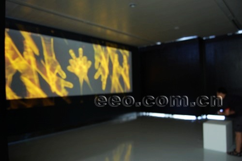在單獨的空間里聽心跳的聲音,隨著心跳的聲音,大屏幕上變幻著圖象:城市、心房、血管、骨關節、握緊的手……