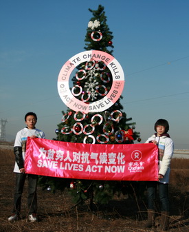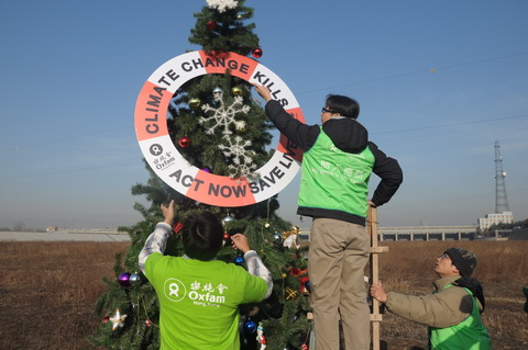 中國民眾也加入了氣候變化全球行動日的活動。12日,樂施會的工作人員及志愿者在北京永定河干涸的河灘上樹起掛滿救生圈的圣誕樹,為發達國家領導人送上“圣誕禮物”,呼吁為貧窮人對抗氣候變化提供資金援助。