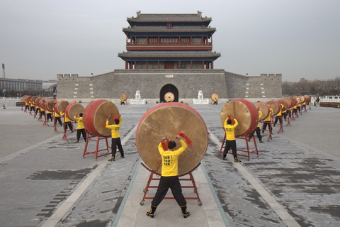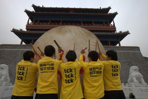 當天下午,國際環保組織“綠色和平”還聯同20名鼓手,在永定門城樓前擂響巨鼓,用鏗鏘鼓聲提醒齊聚哥本哈根的各國首腦,必須在余下的6天內達成一份公平和強而有力的氣候協議。