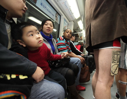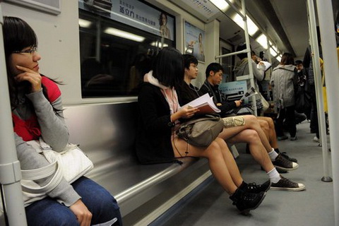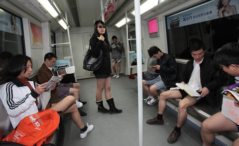 1月17日中午時分,在廣州地鐵二號線出現了一群年輕人,他們用“不穿褲子坐地鐵”的行為藝術方式,宣傳低碳生活、迎接亞運。