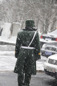 3月7日,北京海淀區等地飄起了零星雪花。至深夜,雪量加大,氣象部門預計,全市平均雪量為3毫米,為中雪。時值兩會,我們的記者拍到在雪中維護秩序的警察及戰士,在此也向他們致敬。