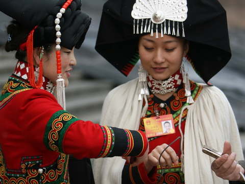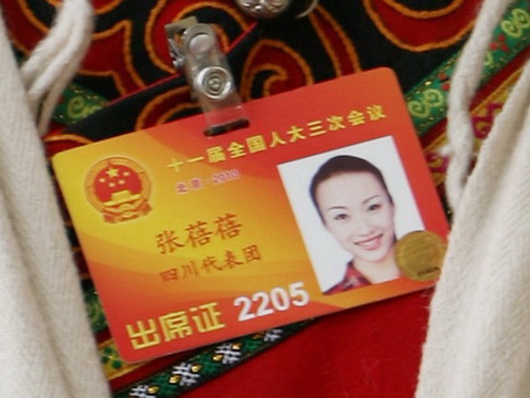在四川廣安代表發言的時候,我終于發現了張蓓蓓,她戴著一個高高的頭飾,正微笑的跟旁邊一位同樣年輕的姑娘竊竊私語。