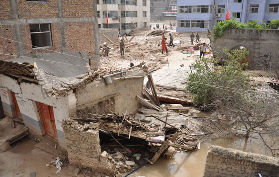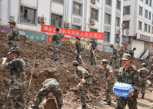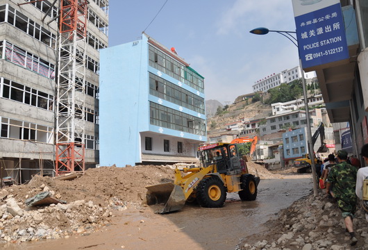 8月11日,蘭州軍區救援部隊正對舟曲縣城的主要干道進行淤泥清理,保證縣城主干道盡快恢復暢通。記者 陳勇/攝