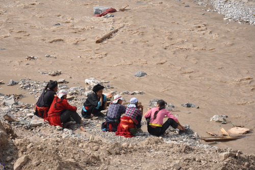 8月9日,白龍江邊幾位百姓望著洶涌的洪水發呆,一天前,他們的親人剛在這場突如其來的天災喪生。記者 陳勇/攝