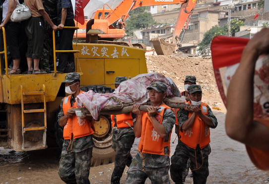 舟曲縣城,幾名解放軍官兵抬著一具剛發現的遇難者尸體,向尸體擺放點走去。記者 陳勇/攝