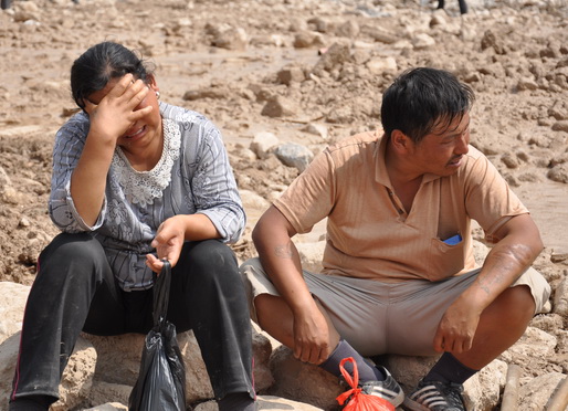 8月10日,兩位百姓坐在月圓村災難現場,流著眼淚,他的親人在這里被吞沒。記者 陳勇/攝