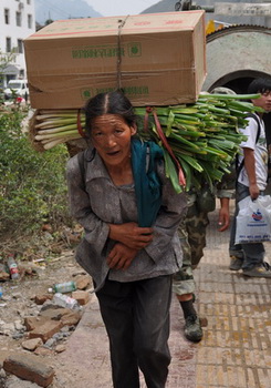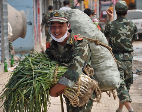 8月11日,一位武警官兵背著大蔥和蒜準備前往災民安置點。記者 陳勇/攝