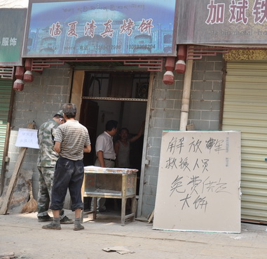 8月9日,一家臨夏烤餅店,為感激解放軍部隊和救援人員在災難中的幫助,免費為他們供應大餅。記者 陳勇/攝