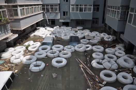 8月10日,舟曲縣城江橋邊的一個小區,由于堰塞湖的形成,小區里的一些水管物質和幾輛汽車被浸泡在水里。 記者 陳勇/攝
