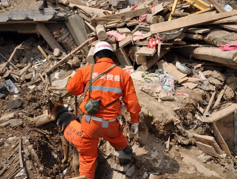 8月9日,為加大搜救力度,各地救援部隊拿出了各自的看家本領,圖中西安消防搜救部隊正用獵犬進行搜索。記者 陳勇/攝