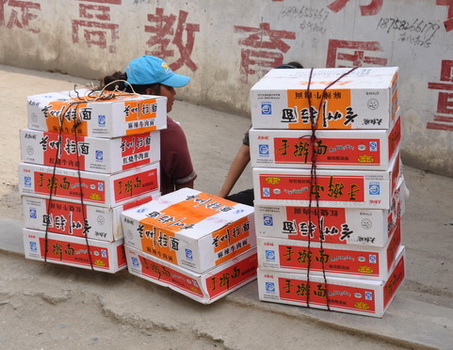 兩名受災民眾背著他們一家幾口人幾天的糧食在路邊休息,未來的日子里,他們就靠著方便面生活。記者 陳勇/攝