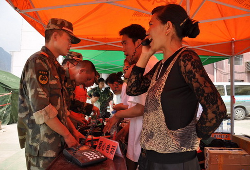 8月10日,在舟曲縣政府廣場門前的中國移動通信的帳篷里,一些救援隊伍官兵和百姓正用免費電話給家人報平安。記者 陳勇/攝