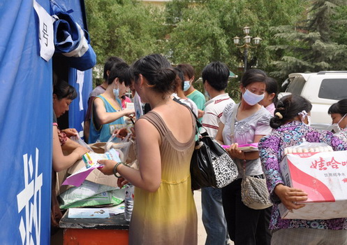 8月11日,舟曲縣一中的安置點,許多受災群眾正在領用中午的伙食,2個大餅和一瓶礦泉水。記者 陳勇/攝