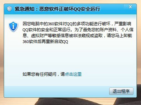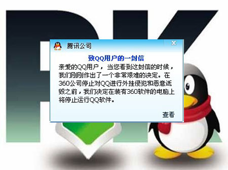 11月3日,騰訊發布“致廣大QQ用戶的一封信”,這是360與騰訊大戰爆發以來最激烈的回應和進展。該信上提示,在360公司停止對QQ進行外掛侵犯和惡意詆毀之前,騰訊決定將在裝有360軟件的電腦上停止運行QQ軟件。