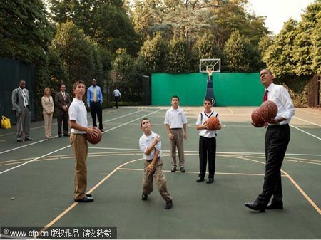 圖一:2010年7月6日,總統奧巴馬和賈斯汀·弗里德蘭德以及他的家人在白宮球場打球。賈斯汀·弗里德蘭德在2009年3月確診為腦瘤。