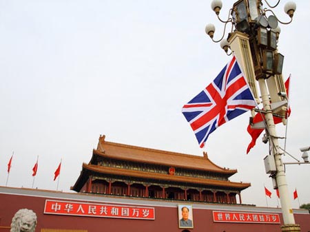2010年11月9日,北京天安門廣場升起英國國旗 歡迎英國首相卡梅倫訪華。