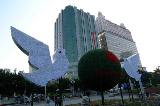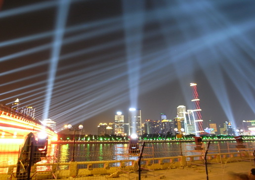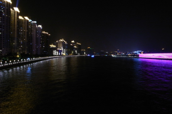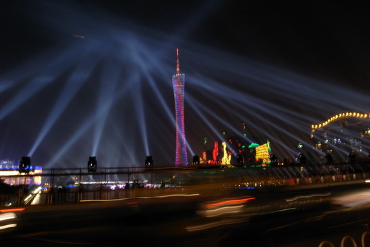 廣州新標志物——廣州塔。11月8日晚,亞運會開幕式進行第三次彩排,開幕式場館海心沙及珠江兩岸建筑利用燈光配合制造效果。