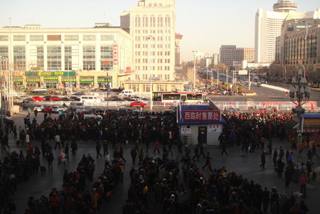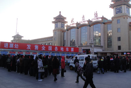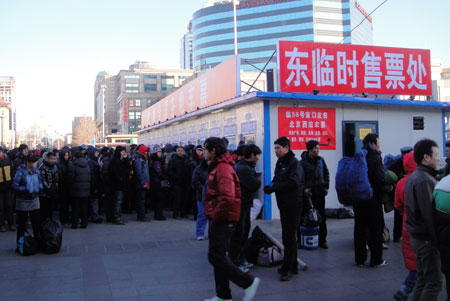 1月19日,為期40天的2011年全國鐵路春運啟動,今年鐵路供需矛盾依然突出。春運第一天的北京站,設在站前廣場的臨時售票處排滿了等待購票的乘客,但早晨的候車大廳客流不多。