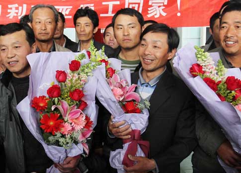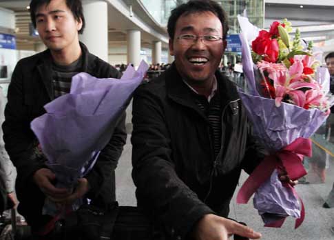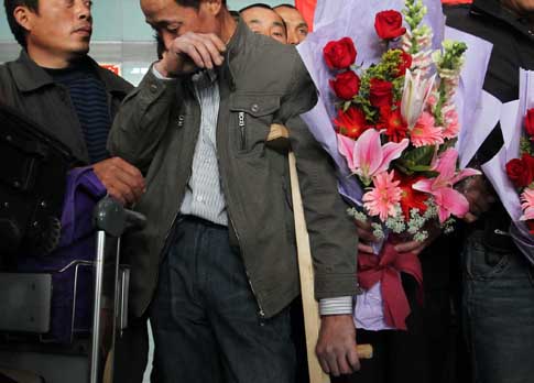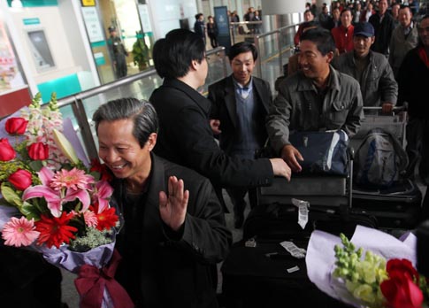 24日上午,首批43位從利比亞的撤離人員乘坐阿聯酋阿提哈德航空公司EY888號航班回國。上午十一點,該公司駐利比亞的翻譯率先走出,隨后十多分鐘,其他四十二位同胞魚貫而出,一位在利比亞施工期間腿部受傷的員工難以抑制激動的眼淚。據一位家在寧夏海原的歸國員工介紹,他們在利比亞負責圖卜魯格大學項目的施工,工地離埃及邊境150多公里。事件發生后,當地雇傭方幫助他們租車離開利比亞,一開始大家很驚慌,但見到前來接應的我國駐埃及使館人員后就踏實了許多。飛行13小時后終于回到祖國,他們這會兒很想盡快回老家看看。