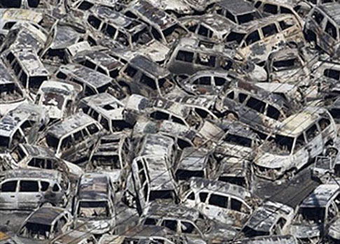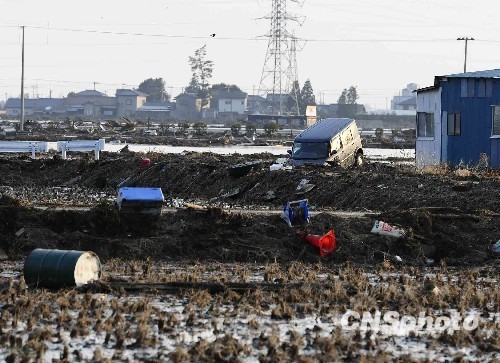 3月13日,日本強震進入第三天,宮城縣仙臺市宮城野區下岡田地區的居民接到大海嘯警報后緊急撤離。圖為被海嘯襲擊后的宮城縣仙臺市宮城野區下岡田地區。
