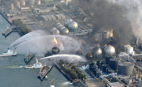 2011年3月12日,日本市原市,震后煉油廠發生火災,消防船在現場滅火。