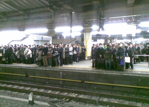 新宿JR線站臺上已然人山人海 人群平均要等4列車才能排隊 北京的早高峰相比只能是小CASE 攝影/張斐斐