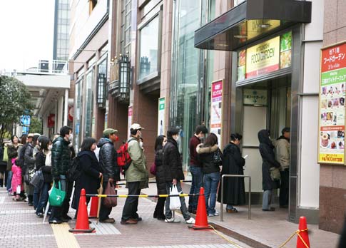 3月21日,仙臺市的銀行重新開業,門口排滿了前來辦理業務的市民。