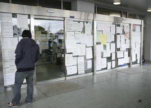 白石市市役所門口,一名日本民眾在看最新交通和生活情況的資料。