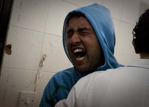2011年3月22日,利比亞班加西,一名男子在太平間里認出自己兄弟的遺體后悲痛不已。