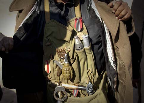 2011年3月22日,利比亞阿季達比亞,利比亞反對派士兵在去往前線前展示他的彈藥。