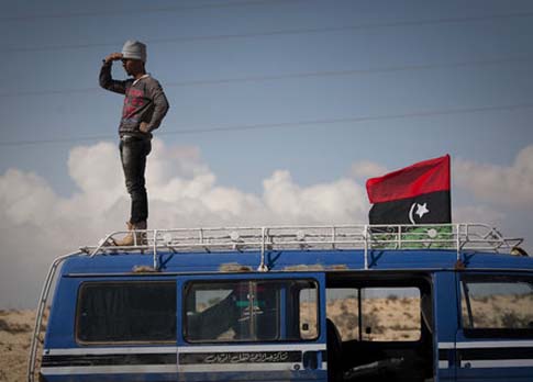 2011年3月22日,利比亞阿季達比亞,一名利比亞人站在車頂上眺望前線。