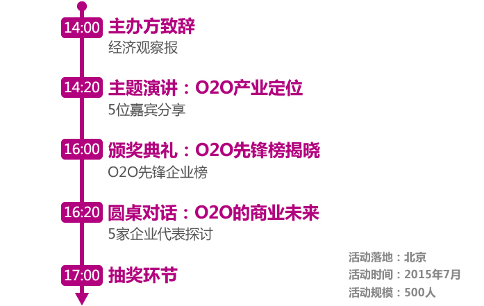2015年,《經濟觀察報》將匯聚行業領先的O2O企業共同打造“V Time·群英匯 O2O先鋒企業論壇”,打造O2O領域的標桿盛會,推動O2O領域的發展。