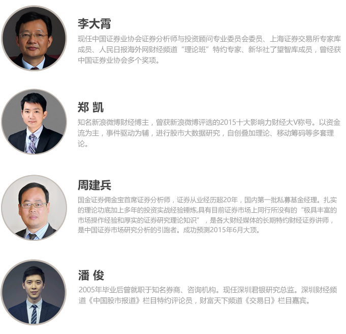 今天,我們請李大霄老師、鄭凱老師、周建兵老師和潘俊老師等幾位業界資深的分析師,為我們答疑解惑,共話投資。